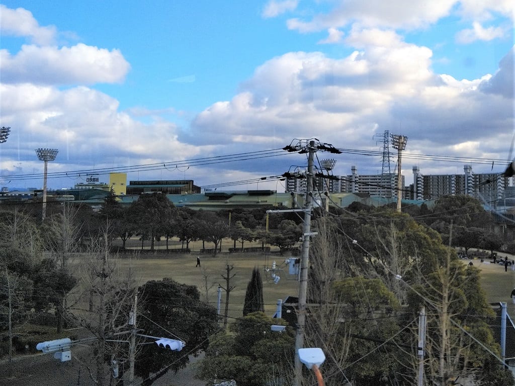 阪神高速高架下にある広場から、外野フェンス越しに辛うじてその様子を伺えました。