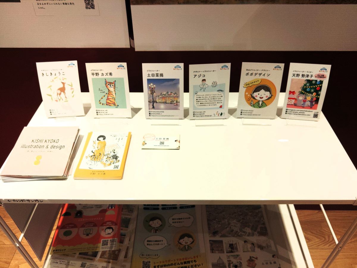 作品の手前には、きしきょうこさん(きしきょうこイラスト・デザイン)、平野カズ希さん(KiwiWorks キーウィワークス)、土田菜摘さん、アジコさん(AJICO DESIGN)、ポポデザイン(恋田衣里さん)、天野勢津子さん(あまちゃ工房)、作家さんたちのネームカードやリーフレットも。