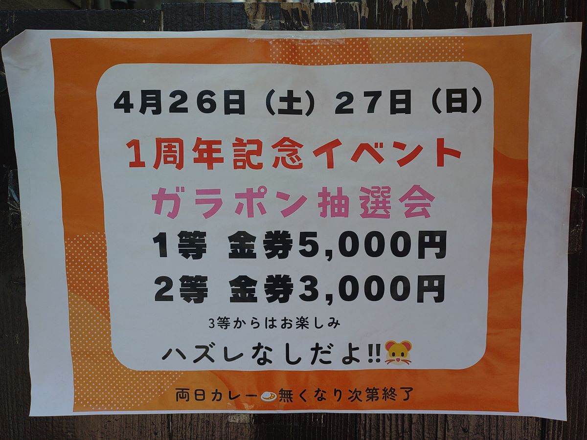 【西宮市】4月6日に開店1周年を迎えた、JR甲子園口ほんわか商店街の「ねずみ女が作る妖怪カレー」。それを記念して、4月26日と27日にガラポン抽選会を開催しています♪