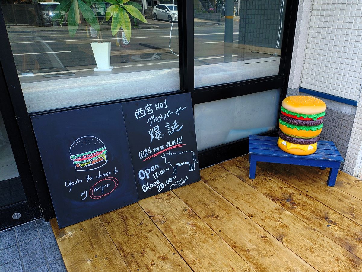店頭には「西宮No.1グルメバーガー爆誕」と書かれたボードと、ハンバーガーの置物が。