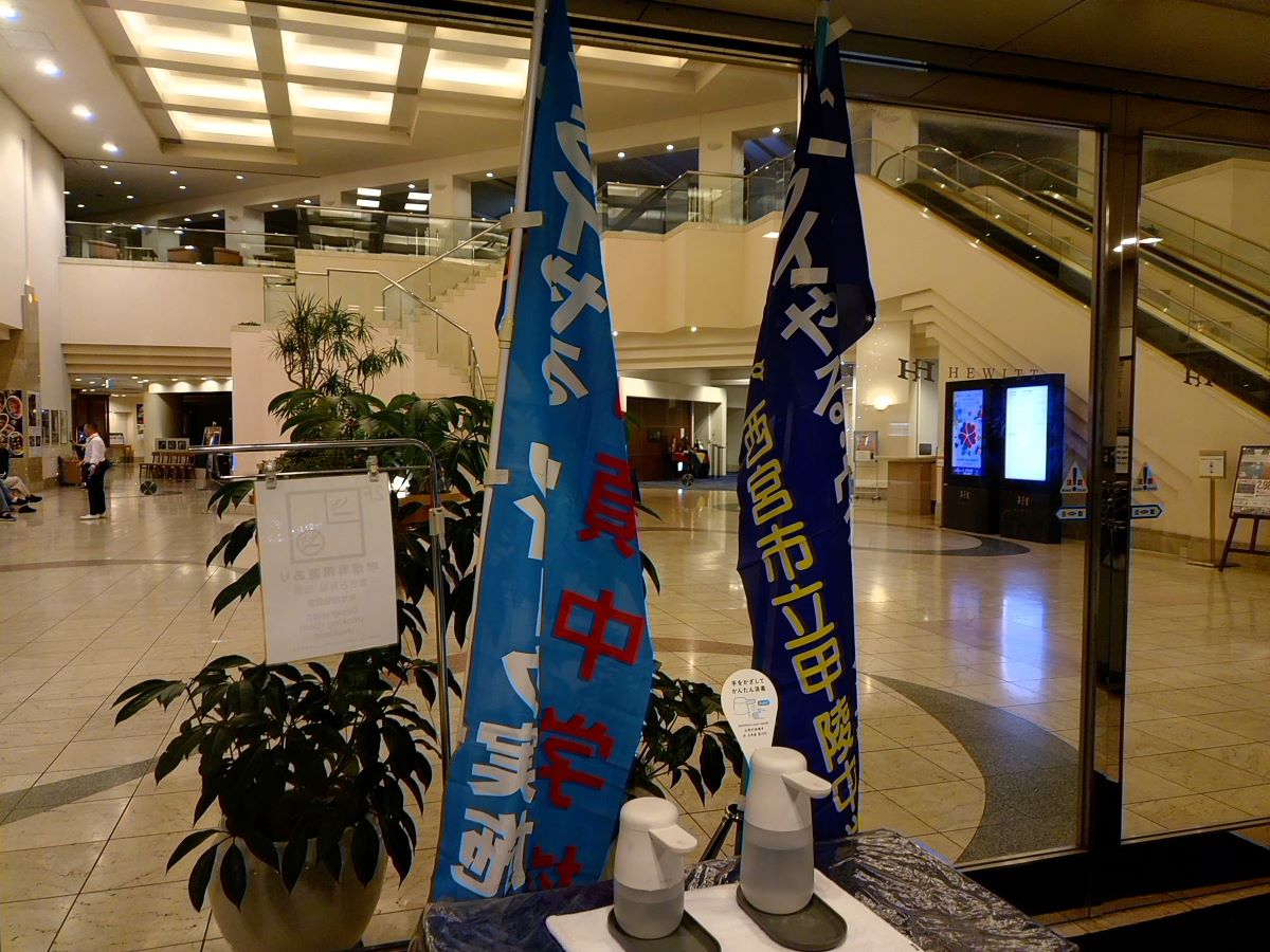 エントランスには、ここで活動を行う学校ののぼりが置かれています。