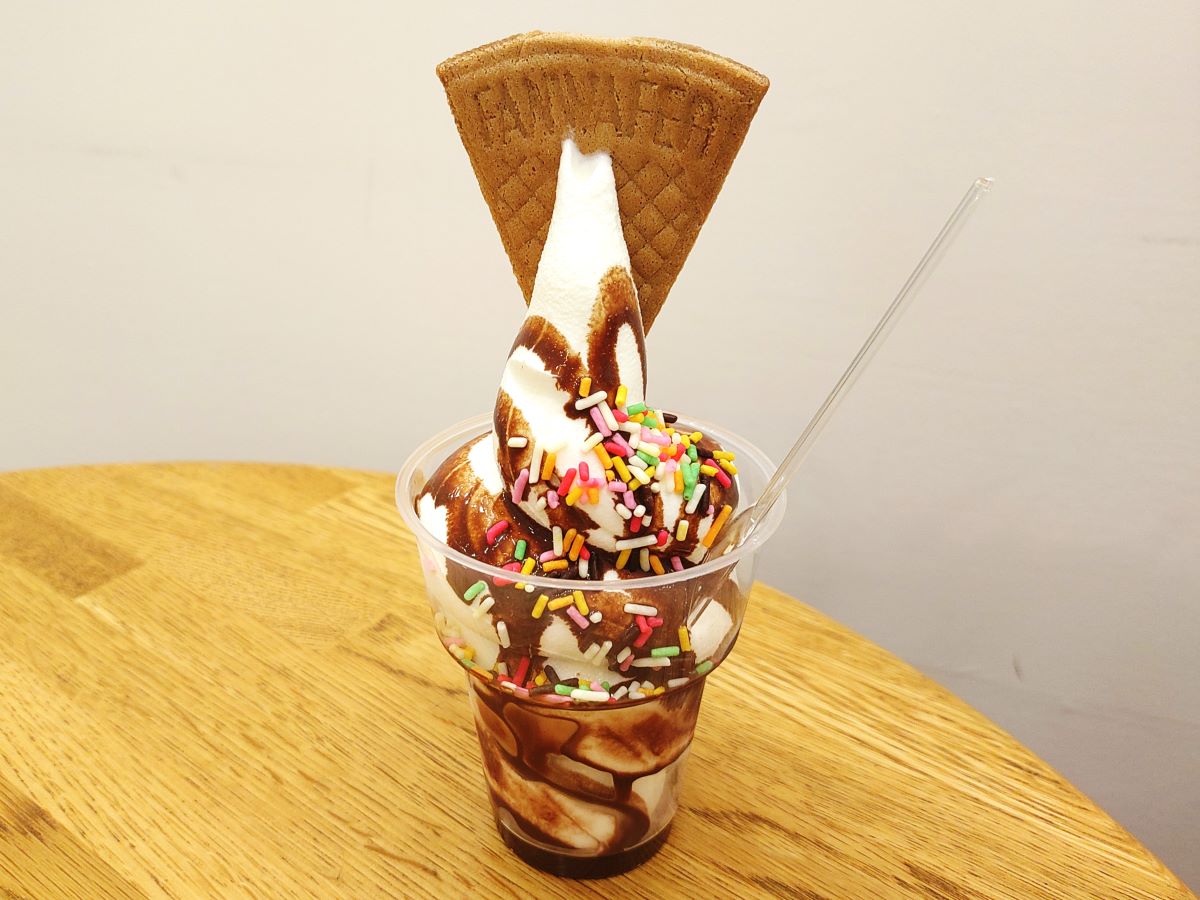 イートインコーナーも用意されていて、これからのシーズンにぴったりな札幌みるくはうすのソフトクリームサンデー(チョコ)をいただきました。