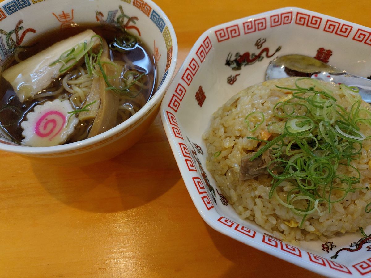 中に入り、店名が入った明チャーハン(右)と、半ラーメンをいただきました。