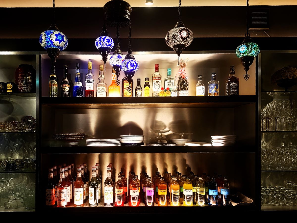 カウンター奥の棚にはカラフルなシロップとグラスが並んでおり、ランプの明かりと見事にシンクロしています。