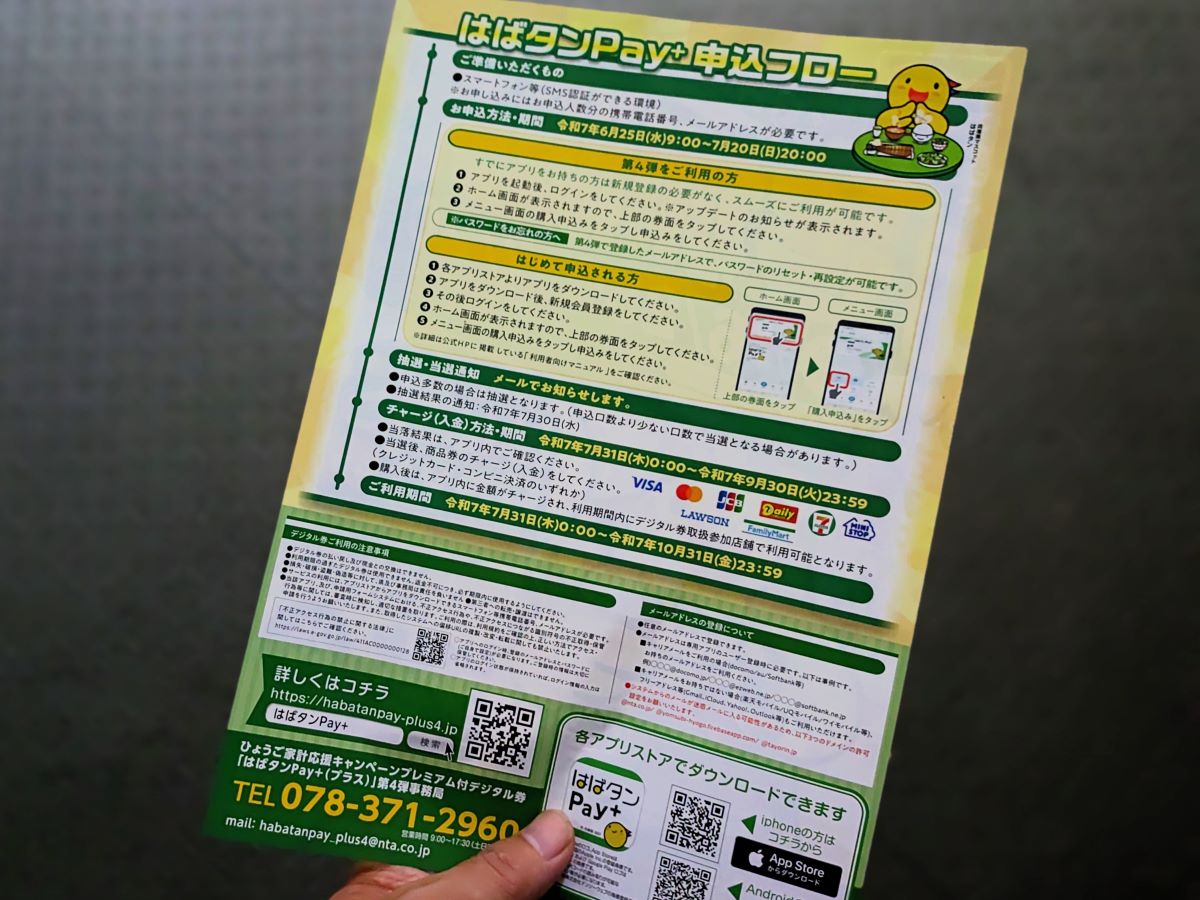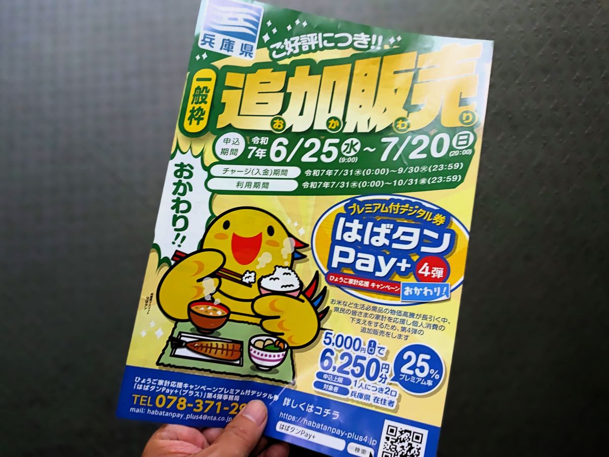 2025年6月25日(水)から、ひょうご家計応援キャンペーン プレミアム付デジタル券「はばタンPay+」第4弾の一般枠追加販売の申し込みが始まります。
