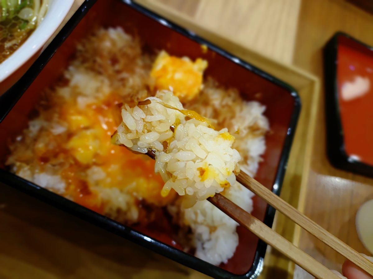 そして玉子かけご飯にはかつお節もまぶされており、口の中で動物系と魚介系の風味がマリアージュ。