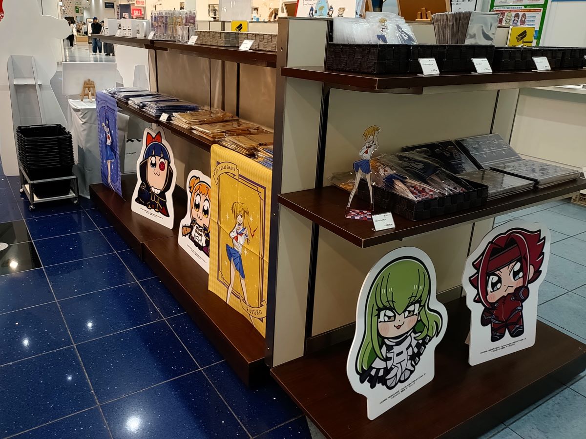 会場には「ポプテピピック」絵柄のルルーシュたちのイラストや「コードギアス」シリーズ絵柄のポプ子・ピピ美たちのイラストなど、コラボグッズが並べられています。