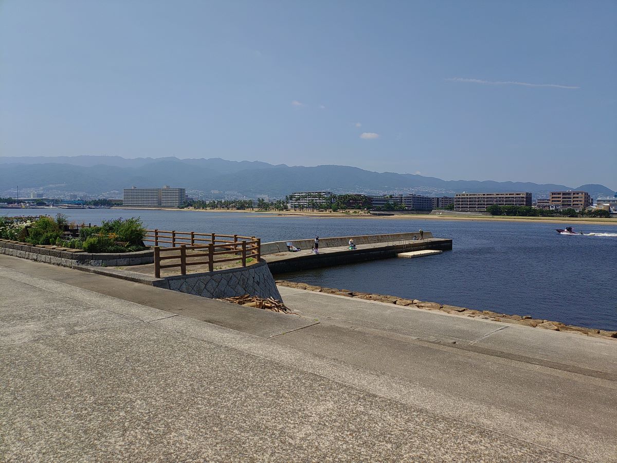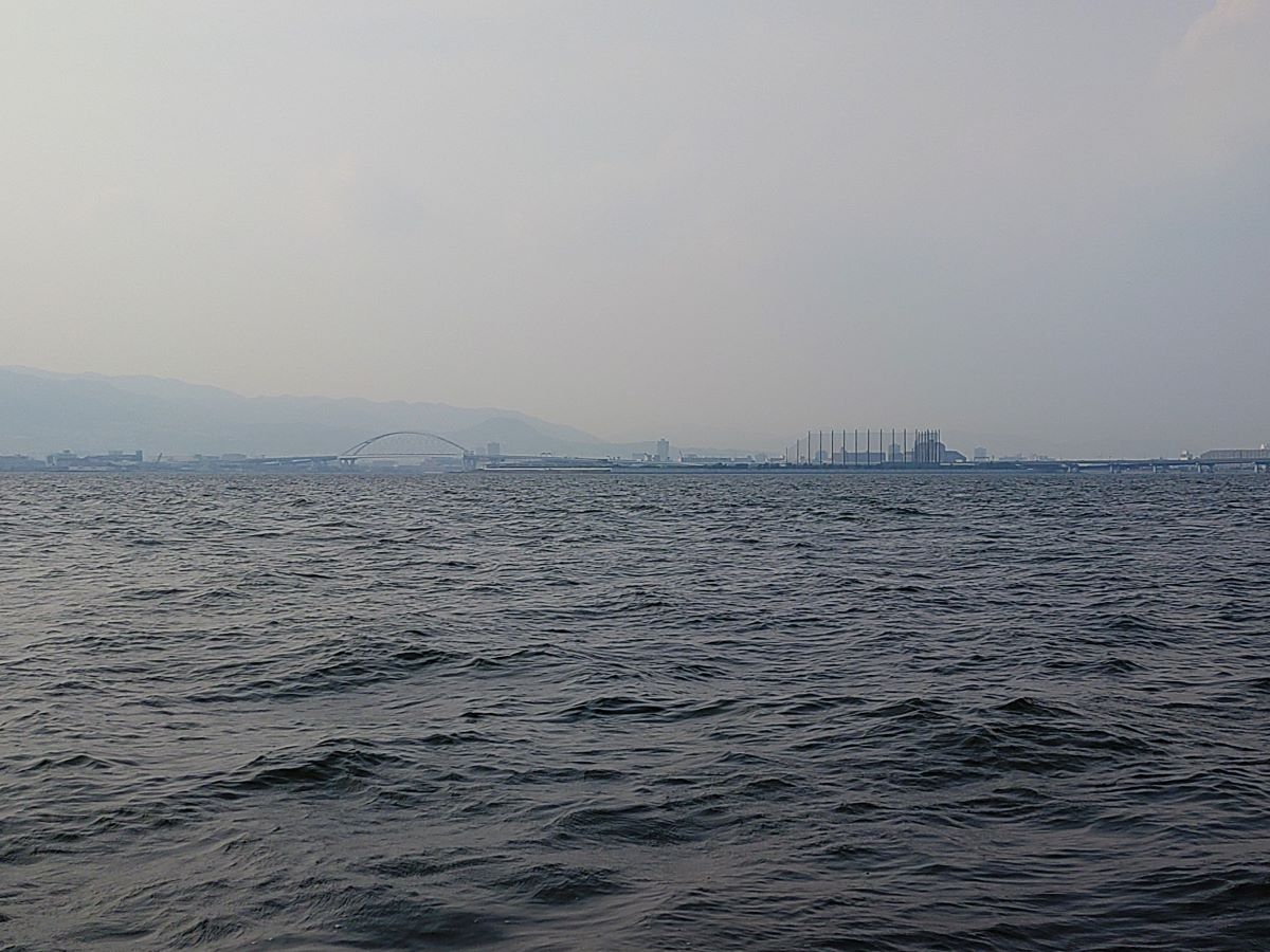 沖合に出ると、はるか遠くに西宮大橋や甲子園浜が。
