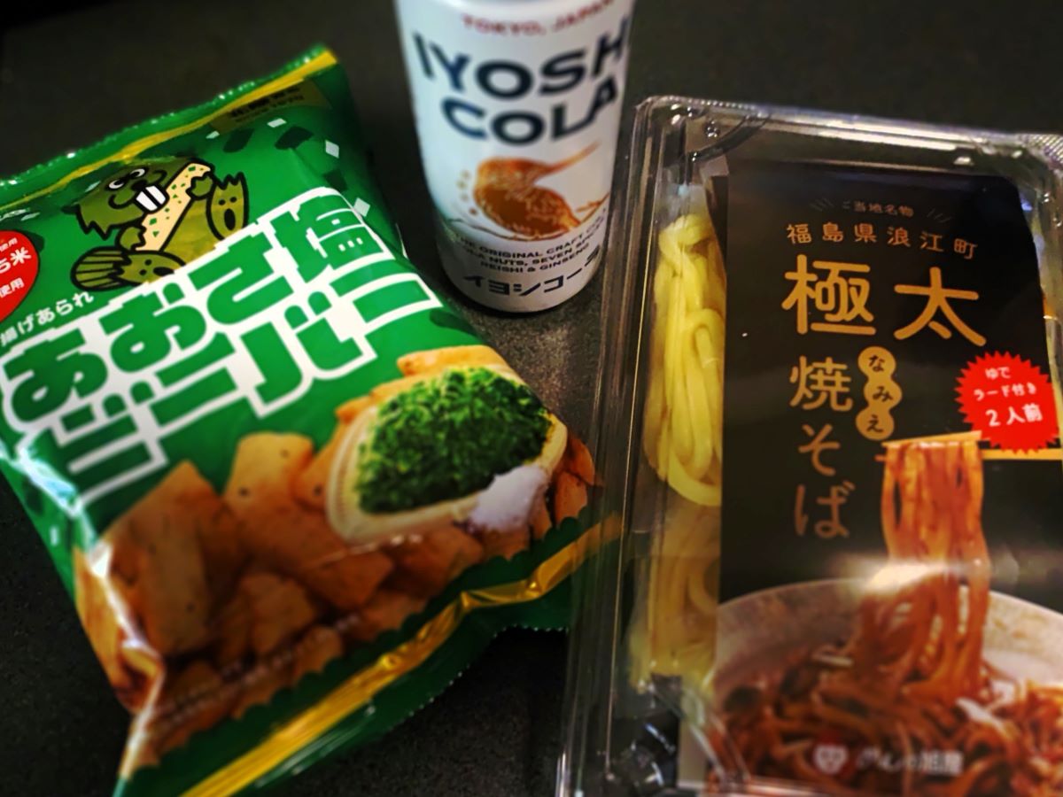 左から石川県のあおさ塩ビーバー、東京都のイヨシコーラ、福島県の極太なみえ焼そばという組み合わせは、ここでしか見られないかも。