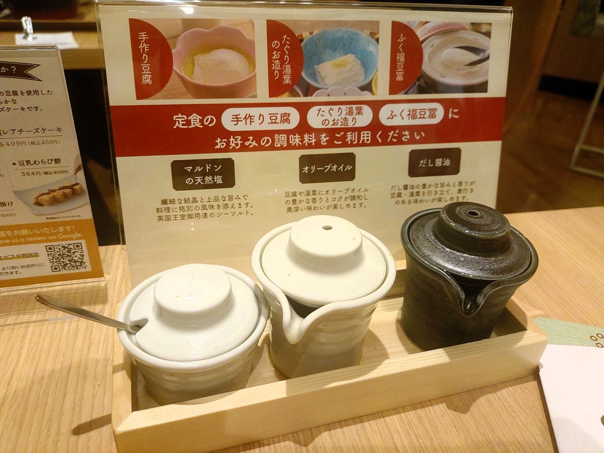 豆腐はプレーンの状態で出てくるので、↓↓の調味料でお好みの味付けに。