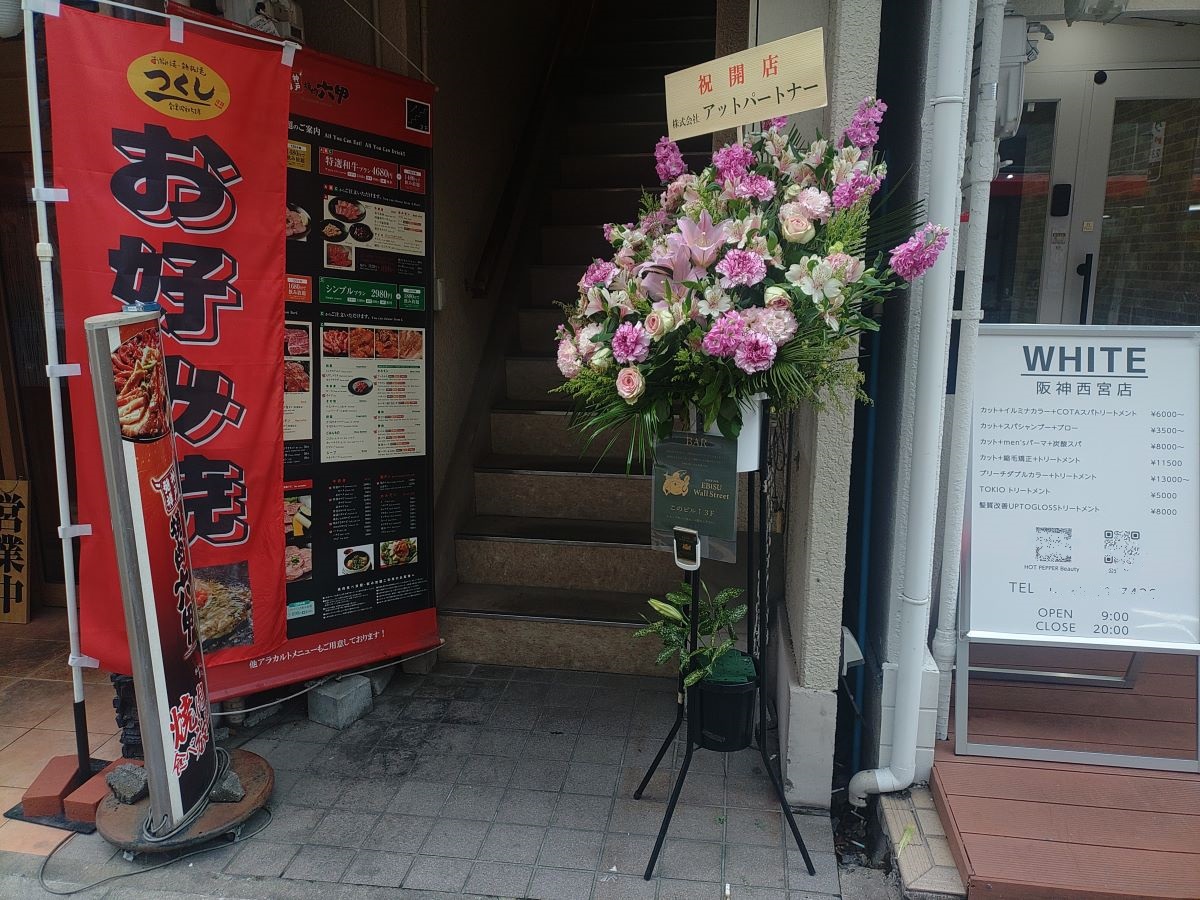 駅すぐ南側のビルに↓↓祝い花を発見!