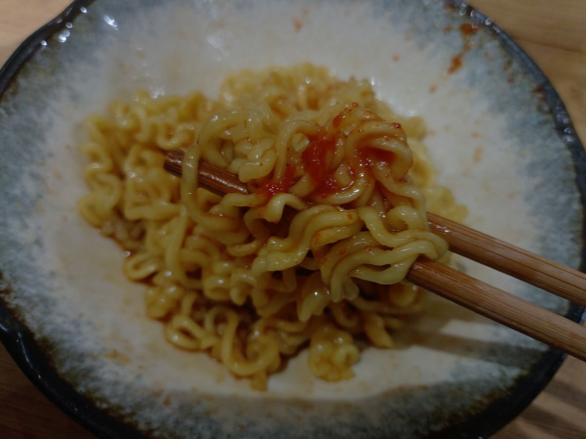 インスタント麺がスープを吸って、旨味を余すところなくいただけました。