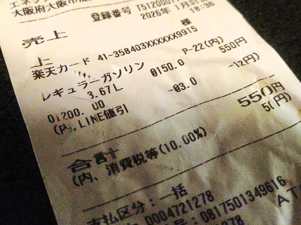 別のガソリンスタンドのレシートになりますが、1月31日(土)には同150円(税込)だったことを考えると大幅に値上がりしています。