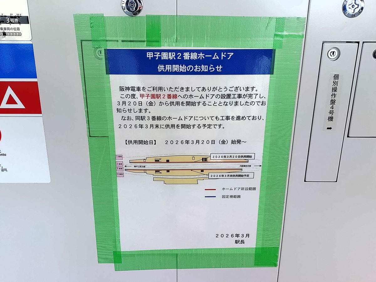 なお、神戸方面の3番線ホームドアも、3月末までに供用開始となる模様です。