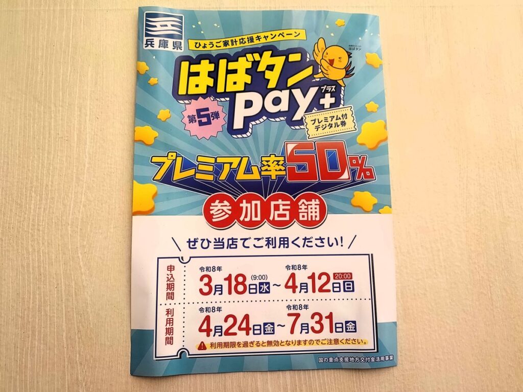 2026年3月18日(水)から4月12日(日)にかけて申し込み受付が行われた、ひょうご家計応援キャンペーンプレミアム付デジタル券「はばタンPay+(プラス)第5弾」。