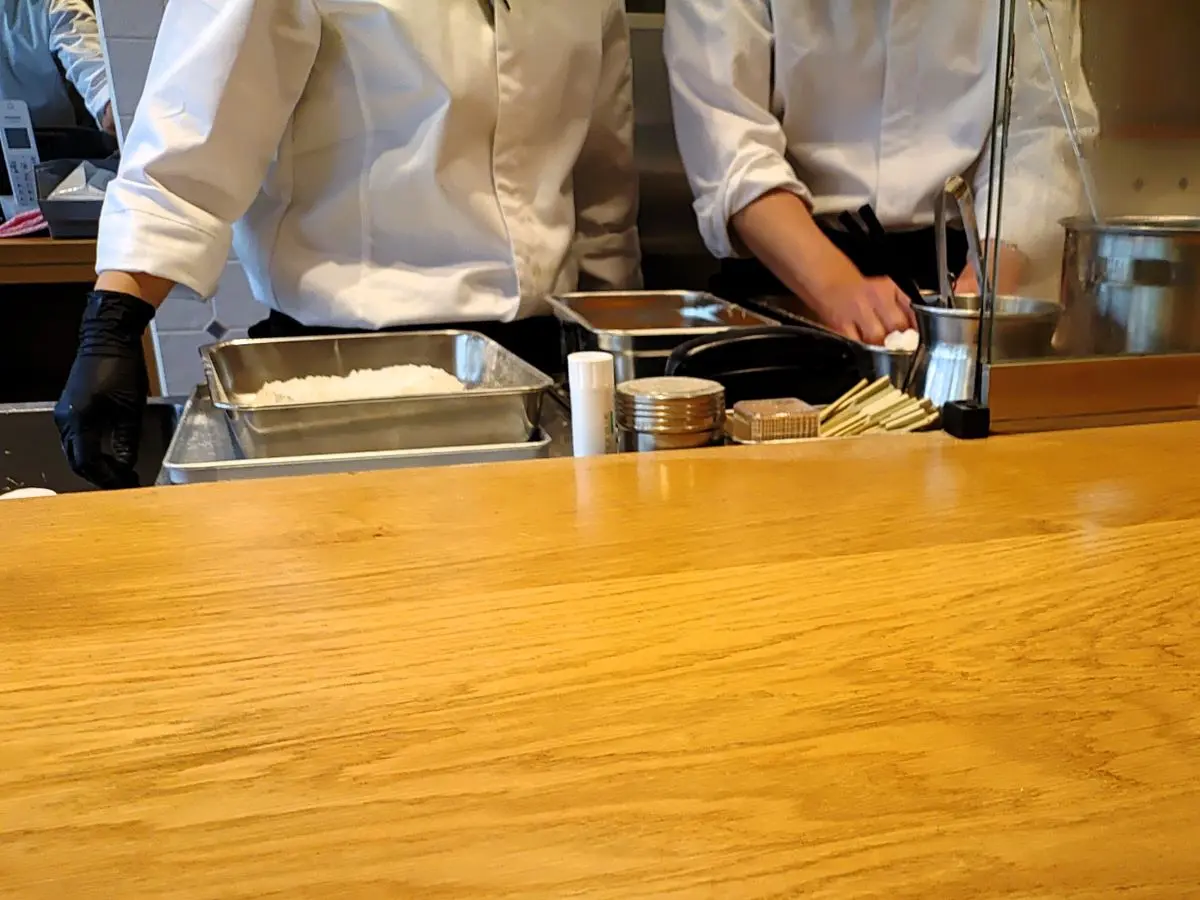 カウンター席に座ると、目の前でかつを揚げる様子が見られます。
